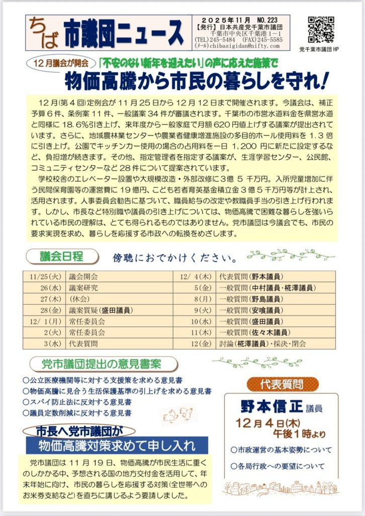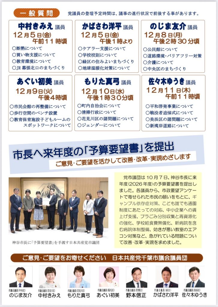 日本共産党市議団は、今議会でも市民の要求実現を求め、「暮らしを応援する市政」への転換をめざし、最後まで力を尽くします。引き続き、皆様の声を議会へ届けるため、ご意見をお寄せください。