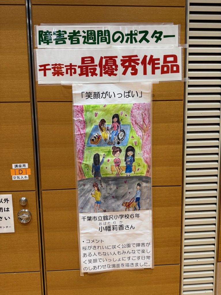 本日、12月6日(土)に開催された「第27回千葉市障害者福祉大会」に、来賓出席させていただきました。会場には、障害者週間ポスターの最優秀作品(千葉市立鶴沢小学校6年 小幡莉香さん)が掲示され、「笑顔がいっぱい」という題の通り、皆が生き生きと楽しむ幸せな情景が描かれており、心温まる会場となりました。