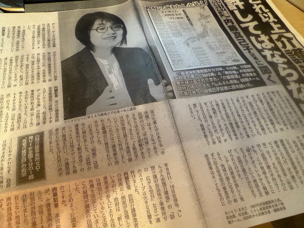先日、雑誌『サンデー毎日』にて、『しんぶん赤旗』特報チームの内藤真己子記者が、介護の現場で起きている衝撃的な実態を報告していました。タイトルは「これ以上介護崩壊を許してはならない」。