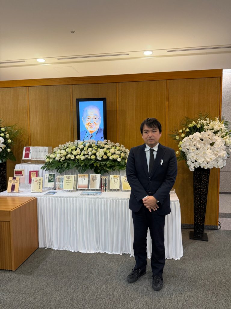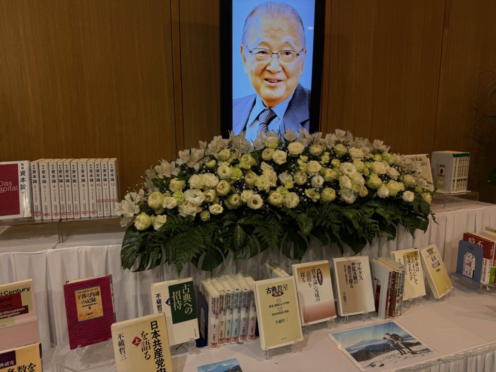 エントランスホールに設けられた会場には、花々に囲まれた不破さんの遺影が掲げられ、その穏やかながらも鋭い知性を感じさせる眼差しに、改めてお別れの寂しさがこみ上げてきました。会場には不破さんの膨大な著作も展示されており、手に取ってその足跡を辿る方々の姿が印象的でした。